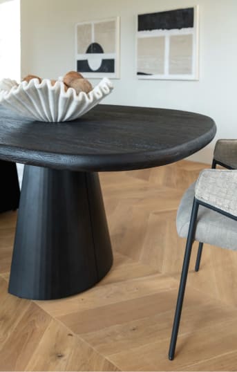 Noch gemütlicher wird das gemeinsame Essen an einem Esstisch, der sich sehen lassen kann! Wie wäre es mit diesem einzigartigen Esstisch ARAWOOD von XOOON? ARAWOOD ist ein Blickfang aus massiver Eiche mit einer organisch geformten Tischplatte. Der Tisch ist mit schwarzer oder naturbelassener Platte erhältlich und steht auf zwei halbkonischen Beinen aus schwarzem Metall. Die sich nach oben verjüngenden Beine bilden einen luftigen Kontrast zur massiven Optik der Tischplatte aus Eichenholz. ARAWOOD hat eine Größe von 270 x 120 cm.